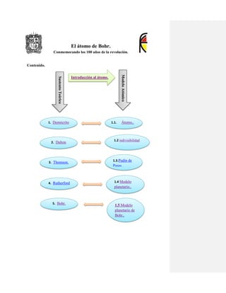El documento describe la evolución del modelo atómico a través de la historia. Demócrito y Dalton propusieron que los átomos eran las partículas indivisibles más pequeñas de la materia. Thomson propuso un modelo de átomo con una esfera positiva y electrones incrustados. Rutherford descubrió el núcleo atómico a través de experimentos de dispersión. Bohr propuso un modelo planetario donde los electrones orbitan en niveles de energía definidos, resolviendo problemas con modelos anteriores.