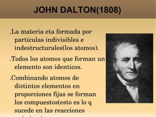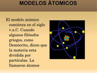 El documento resume los principales modelos atómicos desde la antigua Grecia hasta principios del siglo XX. Demócrito propuso que la materia estaba compuesta de átomos indivisibles. John Dalton desarrolló este modelo afirmando que los átomos de un mismo elemento son idénticos y que los compuestos se forman cuando los átomos se combinan en proporciones fijas. Joseph Thomson descubrió el electrón y propuso un modelo en el que los átomos estaban compuestos por una esfera positiva con electrones dentro. Ernest Rutherford desc