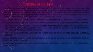 El documento resume los principales modelos atómicos desde la teoría de Dalton hasta el modelo actual. Comienza explicando la teoría atómica de Dalton de 1809, luego describe los modelos de Thomson, Rutherford, Bohr y otros, los cuales fueron evolucionando a medida que se descubrían nuevas partículas como el electrón, protón y neutrón. Finalmente, explica cómo el modelo actual se basa en la ecuación de Schrödinger y los números cuánticos para describir probabilísticamente la posición y energía de los electrones.