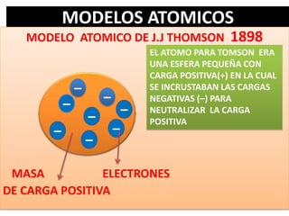 El documento presenta una descripción de los modelos atómicos a través de la historia, comenzando con el modelo de Thomson en 1898 que ve al átomo como una esfera con carga positiva en la que se incrustan electrones negativos. Luego, el modelo de Rutherford en 1911 propone que la carga positiva y la mayor parte de la masa están concentradas en un pequeño núcleo alrededor del cual giran los electrones. Finalmente, el modelo de Bohr en 1913 introduce la idea de que los electrones solo pueden orbitar en ciertos niveles de