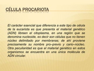 Las células se clasifican en procariotas, que son más simples y carecen de núcleo, y eucariotas, que tienen un núcleo definido y estructuras celulares complejas. Las procariotas incluyen diversos tipos de bacterias, mientras que las eucariotas abarcan tanto células animales como vegetales, que presentan diferencias significativas en su estructura. Comprender la diversidad y función de las células es crucial para el estudio de la vida y los procesos biológicos en los organismos.