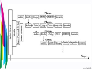 Este documento describe y compara varios modelos de desarrollo de software, incluyendo el modelo en cascada, incremental, evolucionario e incremental evolucionario. El modelo incremental se caracteriza por entregas parciales pero funcionales del software en cada incremento, permitiendo feedback continuo del cliente. El modelo evolucionario extiende el incremental al permitir cambios progresivos en los requisitos a través de iteraciones.