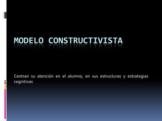 El documento describe diferentes modelos cognitivos individualizados, incluyendo el modelo constructivista, el modelo de aprendizaje significativo y el modelo de aprendizaje por descubrimiento. Estos modelos conciben el aprendizaje como un proceso activo del estudiante que toma en cuenta sus conocimientos previos. El modelo constructivista enfatiza el papel activo del estudiante y que el aprendizaje implica la reorganización cognitiva a través del conflicto cognitivo. Un educador constructivista actúa como mediador del conocimiento para facilitar el apre