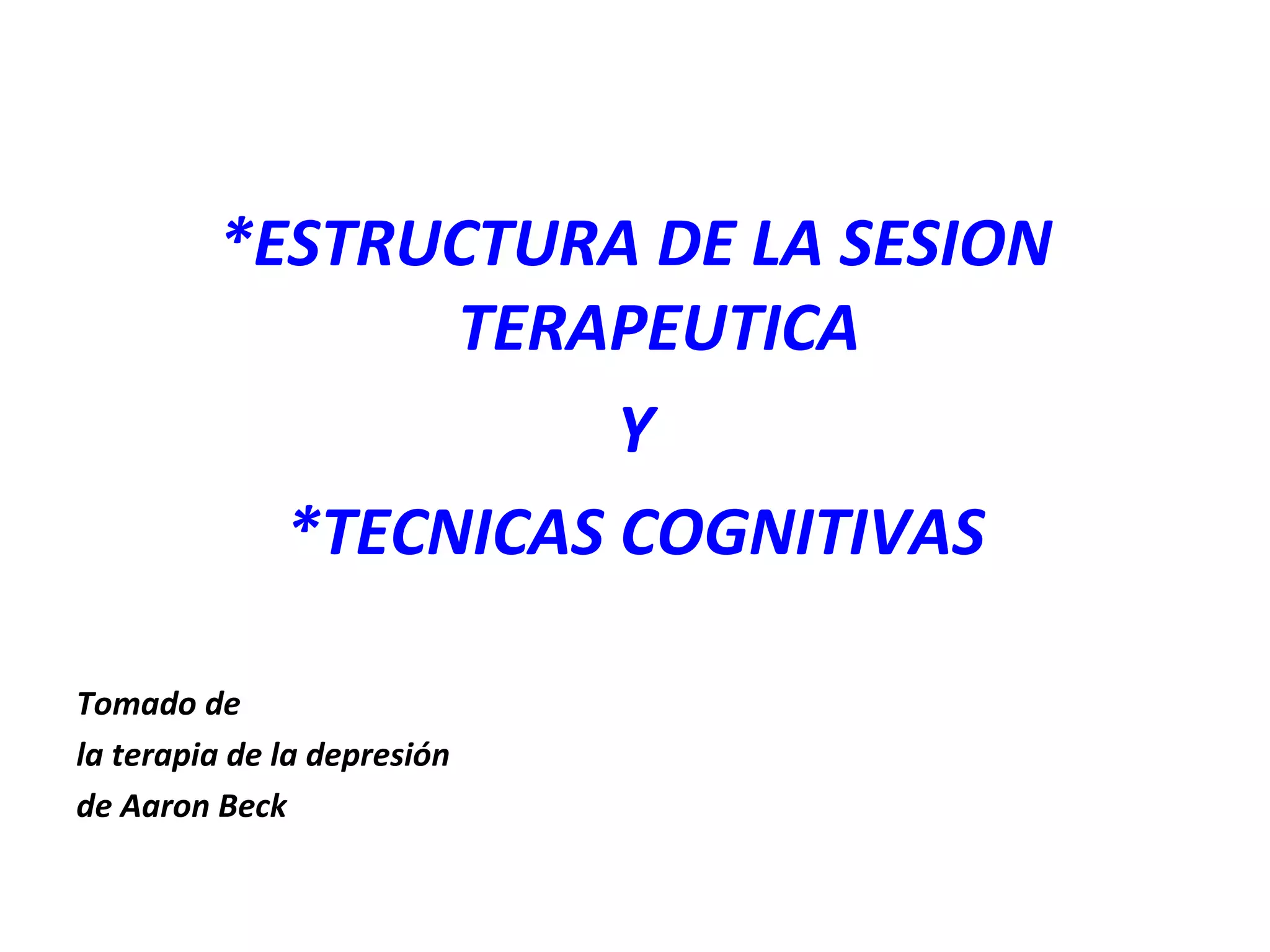 El documento describe la estructura de una sesión terapéutica cognitiva y las técnicas cognitivas empleadas. La sesión se centra en identificar los pensamientos negativos del paciente y generar hipótesis alternativas mediante preguntas. El objetivo es eliminar los síntomas depresivos enseñando al paciente a identificar, cuestionar y modificar sus creencias irracionales.