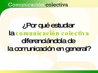 El documento describe los modelos de comunicación colectiva de Lasswell y Shannon-Weaver. Lasswell propuso que la comunicación puede describirse como "quién dice qué a través de qué canal a quién con qué efecto", mientras que Shannon-Weaver desarrollaron un modelo matemático que conceptualiza la comunicación como la transmisión de información a través de un canal. Ambos modelos fueron fundamentales para estructurar el estudio científico de la comunicación.