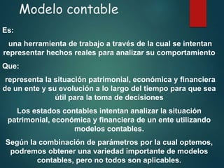 El documento describe los modelos contables como herramientas para representar la situación patrimonial, económica y financiera de una entidad a lo largo del tiempo. Explica que los parámetros que definen un modelo contable incluyen la unidad de medida, los criterios de medición y el capital a mantener. También analiza conceptos como el ajuste por inflación, la determinación de resultados y la incidencia de la inflación en los estados contables.