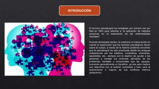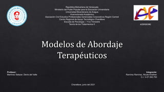 Este documento presenta una introducción a varios modelos de psicoterapia, incluyendo terapia cognitivo-conductual, psicoanalítica, psicodinámica, humanista, gestalt, existencialista, integrativa y tanatológica. Define cada modelo y describe brevemente sus objetivos y enfoques terapéuticos principales.