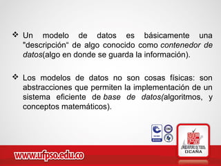 Este documento describe diferentes tipos de modelos de bases de datos, incluyendo modelos jerárquicos, de red, relacionales, orientados a objetos, documentales, deductivas y distribuidas. Explica las características clave de cada modelo y sus ventajas e inconvenientes.