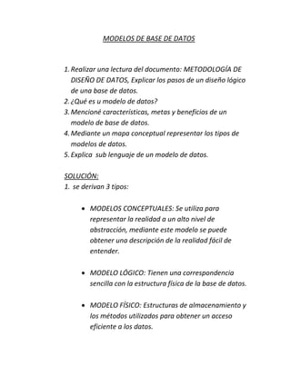 El documento describe los diferentes tipos de modelos de bases de datos, incluyendo modelos conceptuales, lógicos y físicos. Explica que un modelo de datos es un conjunto de herramientas conceptuales para describir datos y relaciones. También cubre las características, metas y beneficios de los modelos de datos, así como el sublenguaje de los modelos de datos que incluye lenguajes de definición y manipulación de datos.