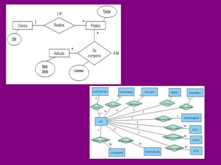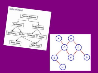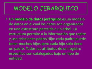 El documento describe tres modelos de datos: el modelo jerárquico, donde la información se organiza en una estructura de árbol con relaciones padre-hijo; el modelo de red, que representa objetos y sus relaciones de manera flexible; y el modelo relacional, el cual se basa en la lógica de predicados y conjuntos para modelar y administrar datos dinámicamente.