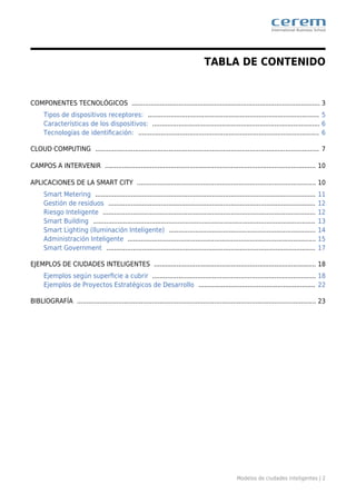 El documento detalla los modelos de ciudades inteligentes que utilizan tecnologías de información y comunicación para mejorar la eficiencia y calidad de vida de los ciudadanos a través de la recopilación y análisis de datos. Se aborda la importancia de la infraestructura adecuada, la digitalización de servicios, y ejemplos concretos de implementación en diversas ciudades. Además, se discuten los retos y beneficios de adoptar un enfoque integral en el desarrollo de estas ciudades, destacando la participación ciudadana y la sostenibilidad.