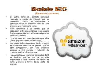 Este documento describe los diferentes modelos de comercio electrónico: B2C (business-to-consumer), donde las empresas venden productos directamente a los consumidores a través de sitios web como Amazon; B2B (business-to-business), donde las empresas realizan transacciones entre ellas; C2C (consumer-to-consumer), como eBay, donde los consumidores pueden comprar y vender entre sí; C2B (consumer-to-business), donde los consumidores fijan las condiciones de venta a las empresas, como Priceline; y G2B (government-to