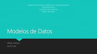 El documento habla sobre los modelos de datos y su importancia para el desarrollo de aplicaciones con bases de datos. Explica que los modelos de datos se clasifican en conceptuales, lógicos y físicos dependiendo del nivel de abstracción, y que el modelo entidad-relación es un modelo conceptual común. También describe conceptos como la abstracción de datos, las restricciones de integridad y la normalización para garantizar la calidad de los datos.