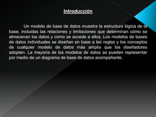 Este documento describe los conceptos fundamentales de los modelos de bases de datos, incluyendo las clasificaciones de los modelos de datos conceptuales, lógicos y físicos. Explica el modelo entidad-relación, sus elementos como entidades, atributos, relaciones y claves, y cómo se representa gráficamente. Finalmente, enfatiza la importancia de los modelos de bases de datos para la gestión efectiva de los datos.