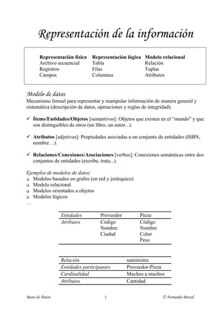 El documento describe los conceptos fundamentales del modelado de datos, incluyendo entidades, atributos, relaciones, y el modelo entidad/relación. Explica cómo las entidades, atributos y relaciones se pueden representar en forma de tablas en un modelo relacional de base de datos. También cubre el modelado semántico y el análisis de requisitos para el diseño de una base de datos.