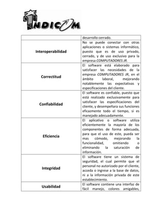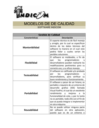 Este documento describe los modelos de calidad de software ISO/IEC 9126 e IndiCom. ISO/IEC 9126 define atributos de calidad como funcionalidad, confiabilidad, eficiencia, usabilidad, mantenibilidad y portabilidad. IndiCom evalúa un software para COMPUTADORES JR considerando su mantenibilidad, flexibilidad, testeabilidad, portabilidad limitada, corrección para satisfacer las necesidades del cliente, y confiabilidad si es manejado adecuadamente.