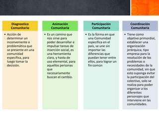 El documento presenta cuatro modelos de desarrollo comunitario. El primer modelo busca implementar el control local sobre el desarrollo a escala regional y vincular políticas económicas, sociales y ambientales con las opciones de la comunidad. El segundo modelo, llamado endógeno, busca potenciar las capacidades internas de una región para fortalecer su sociedad y economía de manera sostenible. El tercer modelo se enfoca en diagnósticos, animación, participación y coordinación comunitaria. El cuarto modelo trata sobre la integración de