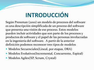 Este documento presenta una introducción a diferentes modelos de procesos de desarrollo de software, incluyendo: