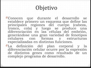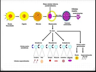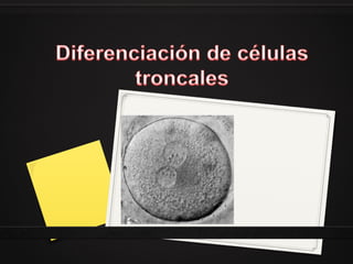 El documento describe los mecanismos de diferenciación celular en embriones. Explica que durante el desarrollo embrionario primero se establece un esquema corporal y luego las células se diferencian gracias a la expresión génica. Las células embrionarias pueden transformar sus características bajo estímulos para especializarse. La diferenciación ocurre a través de la segregación de factores citoplasmáticos durante la división celular y la comunicación celular como la inducción, donde células vecinas influy
