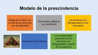 Este documento presenta una descripción de varios modelos de discapacidad, incluyendo el modelo de prescindencia, el modelo médico-biológico/rehabilitador, el modelo social de la discapacidad, el modelo de barreras sociales, el modelo bio-psico-social y el modelo universal de la discapacidad. Cada modelo ofrece una perspectiva diferente sobre la discapacidad y las necesidades de las personas con discapacidad.