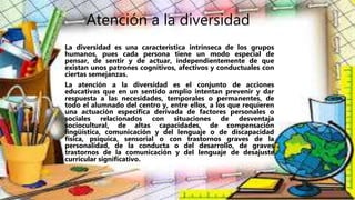 El documento aborda la atención a la diversidad y destaca la importancia de reconocer la discapacidad como una construcción social en lugar de un déficit individual. Se critica la perspectiva tradicional que deshumaniza a las personas con discapacidad y propone un modelo social que aboga por la dignidad, igualdad de oportunidades y adaptación del entorno. Se concluye que el enfoque debe ser integral, resaltando la colaboración interdisciplinaria y la eliminación de estigmas asociados a la discapacidad.