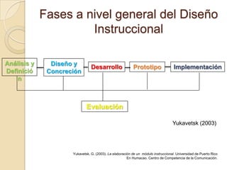 Este documento presenta varios modelos de diseño instruccional (DI) para el desarrollo de contenidos educativos digitales (CED), incluyendo el modelo ADDIE de cinco fases (análisis, diseño, desarrollo, implementación y evaluación), el modelo ASSURE, el modelo sistémico de diseño de instrucción de Dick y Carey, el modelo de Dorrego y el modelo de cuatro componentes. Explica cada fase de los modelos y ofrece ejemplos de actividades y consideraciones en cada etapa del proceso de DI para CED.