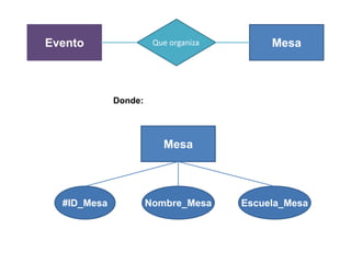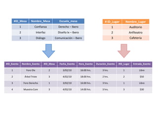 El documento habla sobre la relación entre entidades en una base de datos. Describe tablas para eventos, mesas y lugares que almacenan información sobre cada uno y sus relaciones. Indica que para obtener datos relacionados entre las tablas, como detalles de un evento dado el ID de una mesa, se debe hacer una consulta SQL uniendo las tablas por sus IDs correspondientes.