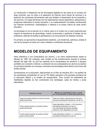 Este documento describe diferentes modelos de equipamiento tecnológico en centros educativos. Explica el modelo 1:1, en el que cada estudiante tiene su propia computadora, y cómo esto permite un aprendizaje más autónomo y colaborativo. También cubre el modelo 1 a 3, donde 3 estudiantes comparten una computadora, y el modelo 1 a 30 para proyecciones y enciclopedias con toda el aula. Finalmente, detalla el programa Habilidades Digitales para Todos y cómo provee formación docente, infraestructura y materiales digitales para integr