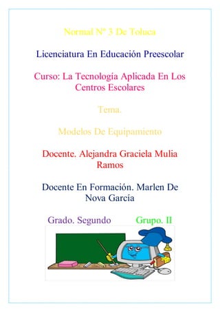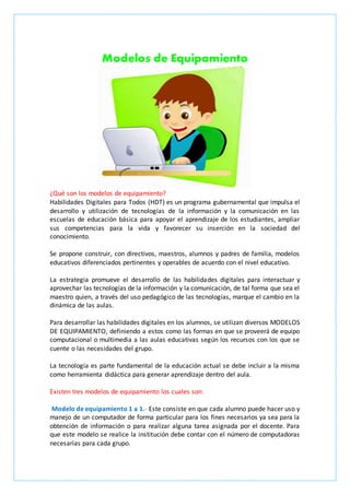 Este documento describe tres modelos de equipamiento tecnológico en las escuelas: 1) un computador por estudiante, 2) computadores compartidos entre grupos de 3 estudiantes, y 3) un computador compartido por todo el grupo. Cada modelo tiene ventajas y desventajas dependiendo de los recursos disponibles y las necesidades de enseñanza. El modelo 1 a 1 es el preferido porque permite a cada estudiante interactuar directamente con la tecnología y aprender de manera autónoma.