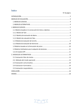 2) Modelos alternativos como la evaluación libre de metas, el método del modo operandi y enfoques comunicativos que se alejan de los datos numéricos. El documento ofrece una visión general de diferentes modelos pero no profundiza en ninguno.