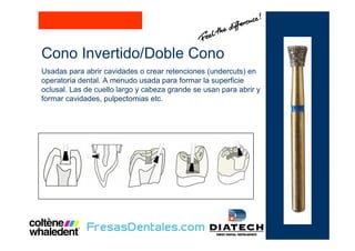 Este documento describe diferentes tipos de fresas dentales utilizadas en operaciones dentales y prótesis, incluyendo bolas, conos invertidos, ruedas, fresas cilíndricas con diferentes puntas (plana, redonda, cónica), fresas de llama y fresas multi-cabezas. Cada tipo de fresa tiene un propósito específico como abrir cavidades, crear retenciones, tallar hombros o definir márgenes y están disponibles en diferentes tamaños y formas.