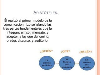 Los modelos de comunicación más importantes incluyen: el modelo de Aristóteles con emisor, mensaje y receptor; el modelo de Lasswell que analiza quién dice qué por qué canal a quién con qué efecto; y el modelo de Berlo que enfatiza cómo los atributos de la fuente, mensaje, canal y receptor afectan la comunicación. Posteriormente, modelos como los de Jakobson y Shannon y Weaver establecieron elementos clave como el código, canal e interferencia que completaron la comprensión del proceso de comunicación.