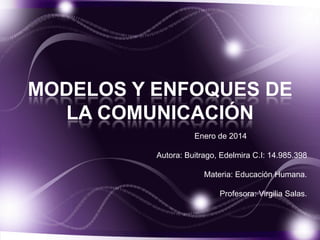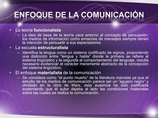 Este documento presenta varios modelos y enfoques de la comunicación. Describe la teoría funcionalista, la escuela estructuralista y el enfoque materialista de la comunicación. Luego, introduce seis modelos de comunicación: el modelo de Lasswell, el modelo de Shannon, el modelo de Berlo, el modelo de Jakobson, el modelo de Maletzke y el modelo dialéctico de Manuel Martín Serrano. Cada modelo se explica brevemente con sus componentes principales.