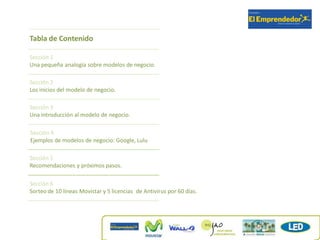 El documento ofrece una guía sobre los modelos de negocio, destacando su importancia para organizar ideas de emprendimiento y asegurar la sustentabilidad. Se presentan estrategias y ejemplos, como el modelo cebo/anzuelo y el caso de Blockbuster, enfatizando la necesidad de adaptarse a las tendencias del mercado. Además, se sugieren recomendaciones y herramientas para desarrollar un modelo de negocio efectivo.