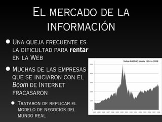 El documento discute nuevos modelos de negocios para los medios en la era digital. Señala que la publicidad ya no parece una buena fuente de ingresos debido a la abundancia de información gratuita. En cambio, sugiere enfocarse en entregar valor agregado a los clientes mediante el filtrado de contenido relevante y cobrar por contenido de alta calidad. También recomienda aprovechar las fortalezas tradicionales como la credibilidad y marca, y explorar nuevas fuentes de ingresos como suscripciones variables