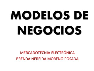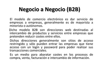 Este documento describe tres modelos de negocios de comercio electrónico: B2B, B2C y B2G. El modelo B2B se refiere al intercambio de productos y servicios entre empresas para reducir costos. El modelo B2C involucra la venta directa de productos y servicios de una empresa a consumidores individuales. El modelo B2G optimiza los procesos entre empresas y el gobierno a través de portales especializados.