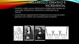 El documento resume varios modelos de procesos de desarrollo de software, incluyendo modelos iterativos e incrementales, el modelo en espiral, modelos evolutivos, el modelo incremental y modelos ágiles. Describe las características clave de cada modelo y algunas de sus ventajas y desventajas. También explica brevemente algunas metodologías ágiles populares como la programación extrema y el desarrollo de software adaptativo.