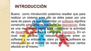 Este documento presenta varios modelos de desarrollo de software, incluyendo el modelo cascada, incremental, espiral, de componentes y ágiles como Scrum y Desarrollo Adaptativo de Software. Describe las fases, actividades, roles y características clave de cada modelo. El objetivo es proporcionar una introducción a los principales enfoques para el desarrollo de software.