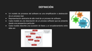 Los modelos de procesos de software incluyen modelos secuenciales como el lineal secuencial y de desarrollo rápido de aplicaciones, el modelo en V, y modelos ágiles como Extreme Programming y SCRUM. También incluyen modelos evolutivos como el de prototipos, desarrollo concurrente y en espiral. Cada modelo describe una sucesión de fases y actividades para el desarrollo de software.