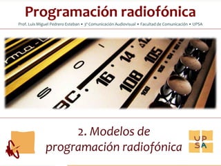 El documento describe los conceptos de programa radiofónico, modelos de programación radiofónica y tipología de programas. Explica que un programa radiofónico es un conjunto de contenidos con una estructura y duración propia, y que existen diferentes tipos de programas como información, música, entretenimiento y deportes. Además, introduce los conceptos de programación radiofónica como la planificación y ordenación de programas según objetivos, audiencia y coherencia, y los modelos de radio convencional enfocada a cada programa y radio especializada enfocada a
