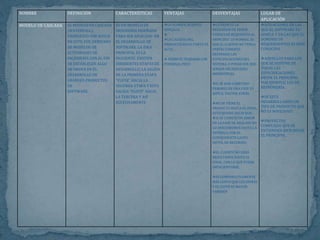 El documento describe diferentes modelos de desarrollo de software, incluyendo el modelo en cascada, el modelo lineal, el modelo evolutivo, el modelo de prototipos y el modelo incremental. Cada modelo se define, describe sus características, ventajas y desventajas, y se indican algunos ejemplos de lugares donde se aplican comúnmente.