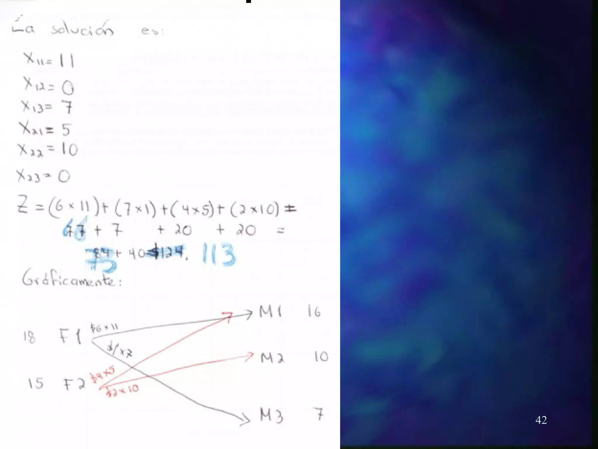 Este documento describe diferentes métodos para resolver problemas de transporte, incluyendo el método de la esquina noroeste, método de costo mínimo (por matriz, fila y columna), y método de Vogel. Explica cómo estos métodos asignan cantidades a transportar desde orígenes a destinos de manera de minimizar costos sujeto a restricciones de oferta y demanda. También presenta ejemplos numéricos para ilustrar la aplicación de estos métodos.