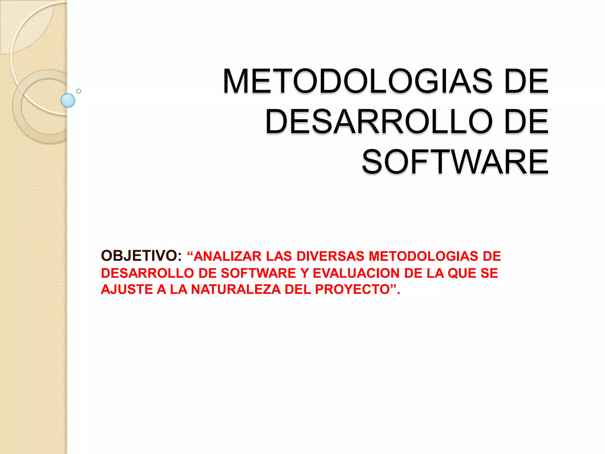 El documento analiza diversas metodologías de desarrollo de software como el modelo en cascada, basado en prototipos, incremental o evolutivo, espiral y orientado a objetos. Explica brevemente cada modelo, sus ventajas y desventajas, y su aplicabilidad dependiendo de la naturaleza del proyecto. El objetivo es evaluar cuál de estas metodologías se ajusta mejor al proyecto considerando sus características.