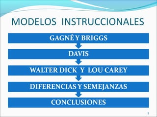 Este documento presenta una comparación de cuatro modelos de diseño instruccional: el modelo de Gagné y Briggs, el modelo de Davis, y el modelo de Dick y Carey. Describe las fases principales de cada modelo y realiza un análisis de sus similitudes y diferencias. Todos los modelos comparten etapas como el análisis de necesidades, objetivos y evaluación, pero difieren en aspectos como la inclusión de la evaluación formativa, revisión del sistema y preparación del instructor. El documento concluye que los modelos sirven como guías para el