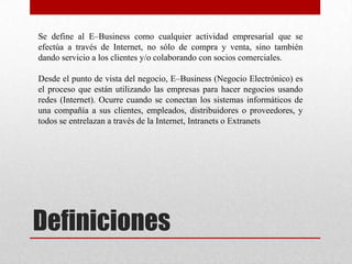 El documento define el e-business como cualquier actividad empresarial que se lleva a cabo a través de Internet, no solo compras y ventas sino también servicios a clientes y colaboración con socios. Explica que la arquitectura de una solución e-business debe implementarse a nivel empresarial para relacionar a accionistas, empleados, socios, proveedores y clientes. Además, señala que modelos como CRM, ERP, SCM y MRO son importantes porque trabajan de forma conjunta para desarrollar el negocio de manera