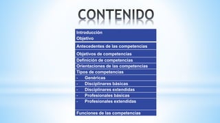 Este documento presenta información sobre las competencias en el ámbito educativo. Define competencias como conjuntos de conocimientos, habilidades y actitudes que debe poseer un egresado para satisfacer las demandas sociales. Describe diferentes tipos de competencias como genéricas, disciplinares básicas y extendidas, y profesionales básicas y extendidas. Explica que las competencias se desarrollan gradualmente a lo largo del proceso educativo y que su función es lograr que los estudiantes aprendan a aprender de forma autónoma y a aplicar lo aprend