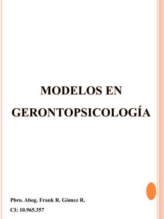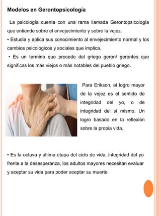 La gerontopsicología estudia el envejecimiento y los cambios psicológicos y sociales asociados a la vejez. Existen diferentes modelos para entender este proceso, como el biomédico que se enfoca en aspectos patológicos, y el biopsicosocial que considera factores biológicos, psicológicos y sociales. La personalidad tiende a conservarse con la edad, aunque se modifican aspectos ligados a la adaptación. La vejez también es una construcción social determinada por el contexto cultural.