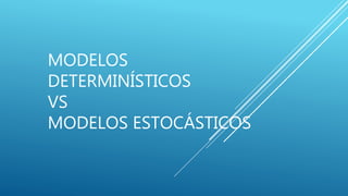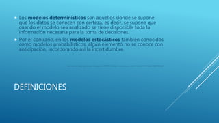 Los modelos determinísticos suponen que toda la información es conocida con certeza, mientras que los modelos estocásticos incorporan elementos aleatorios para representar la incertidumbre. Los modelos determinísticos incluyen planificación de líneas de producción y asignación de aulas, mientras que los modelos estocásticos se usan para filas de espera, gestión de proyectos y pronósticos.