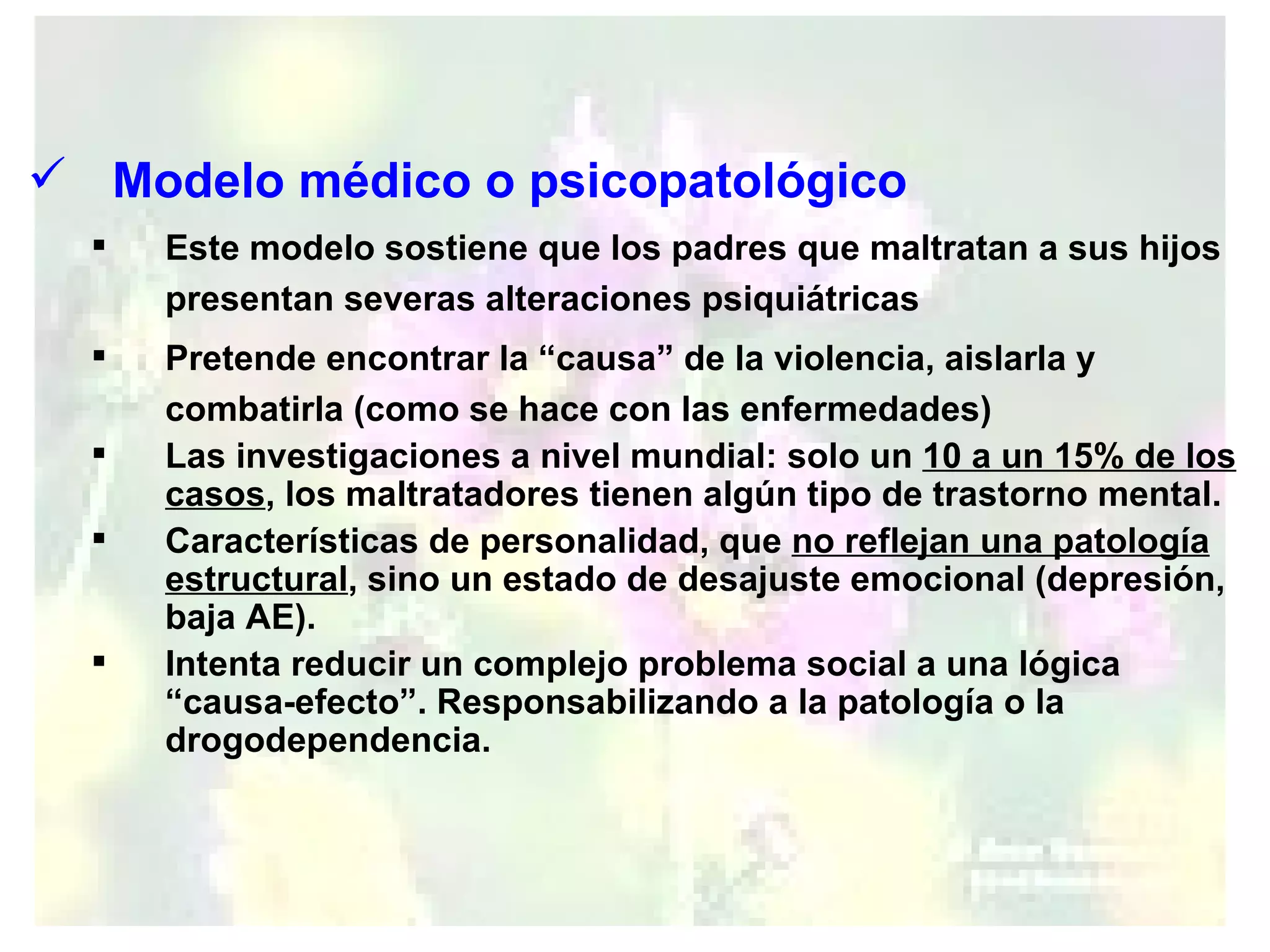 El documento presenta varios modelos para explicar el maltrato infantil. El modelo médico se enfoca en las alteraciones psiquiátricas de los padres, aunque solo una pequeña minoría tiene trastornos mentales. El modelo de vulnerabilidad de los niños considera características de los niños que podrían contribuir a su maltrato. El modelo psicosocial examina las interacciones familiares y el aprendizaje de patrones violentos entre generaciones. El modelo de estilos disciplinarios clasifica los estilos de crianza y disciplina de los padres. Finalmente,