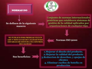 Las normas ISO son estándares internacionales voluntarios que establecen sistemas de gestión de calidad para organizaciones. Las normas ISO 9000, publicadas por primera vez en 1987, son guías para establecer sistemas de control de calidad que mejoran el diseño de productos, la calidad, reducen desechos y quejas de clientes. Las normas ISO buscan unificar criterios de calidad aplicables a empresas privadas para certificar sus sistemas de gestión de la calidad.